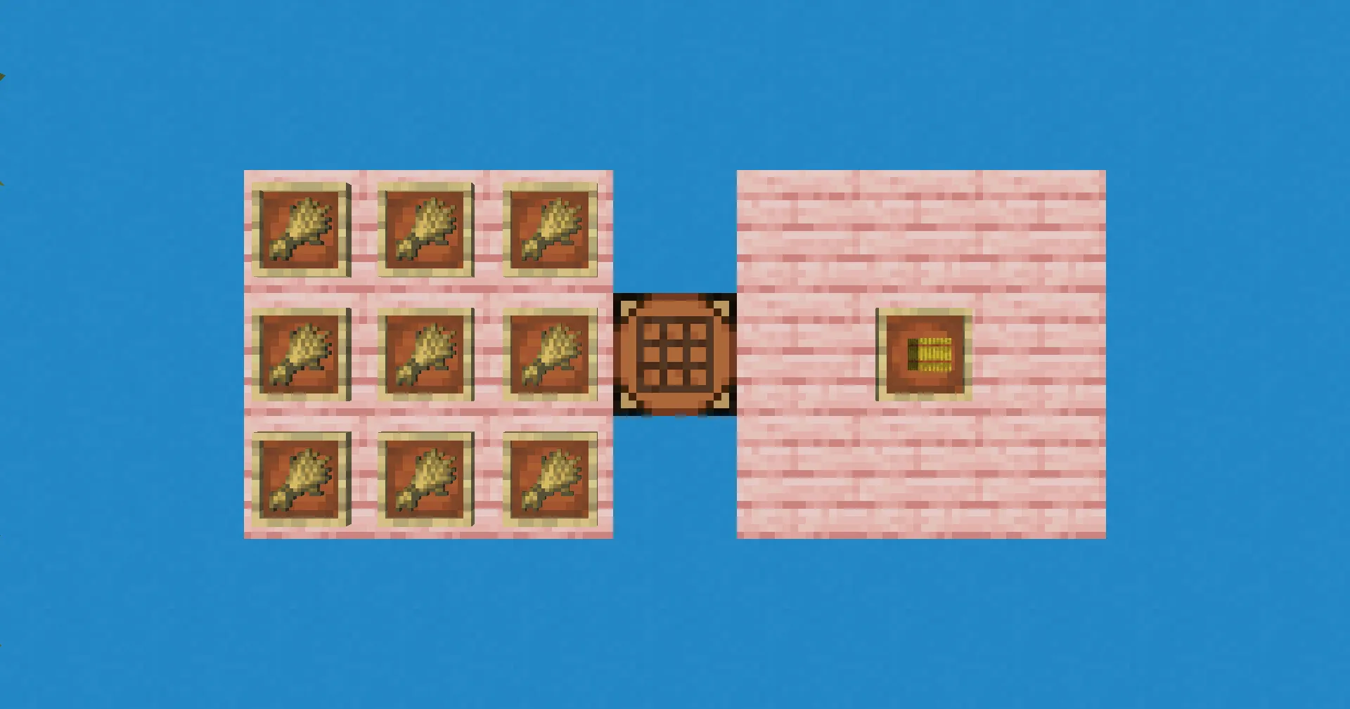 - Crafting: Arrange 9 units of wheat in a 3x3 pattern on a crafting table.